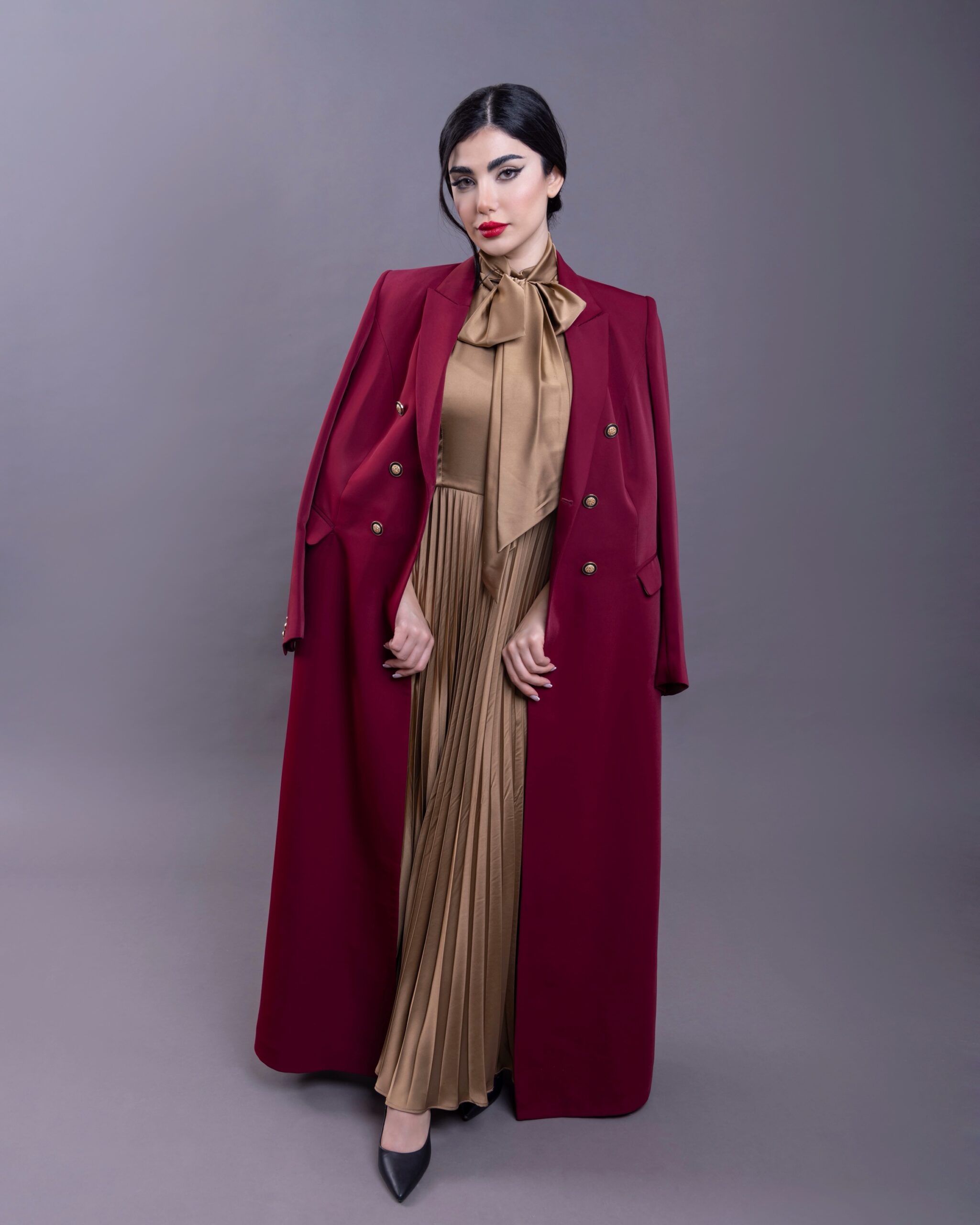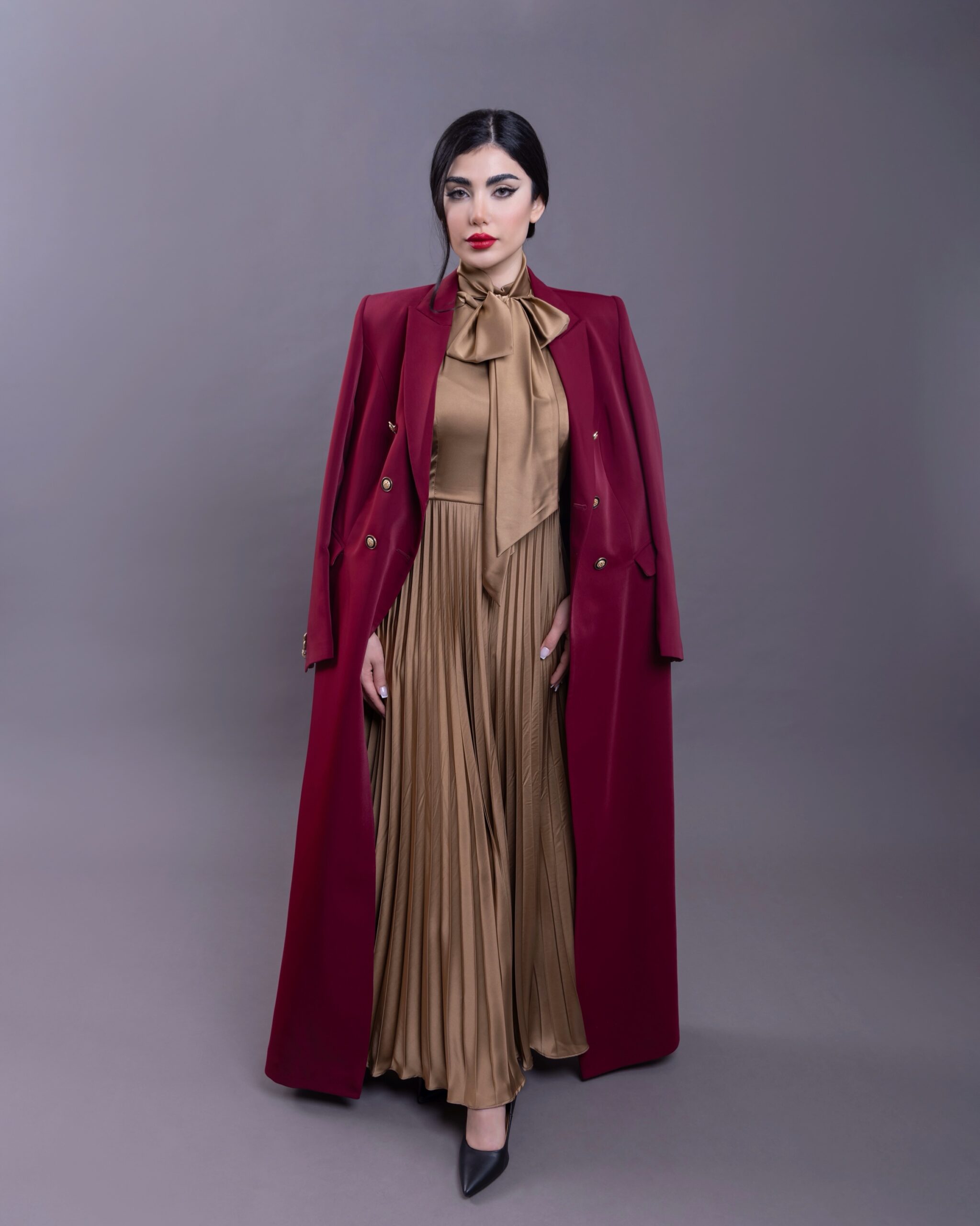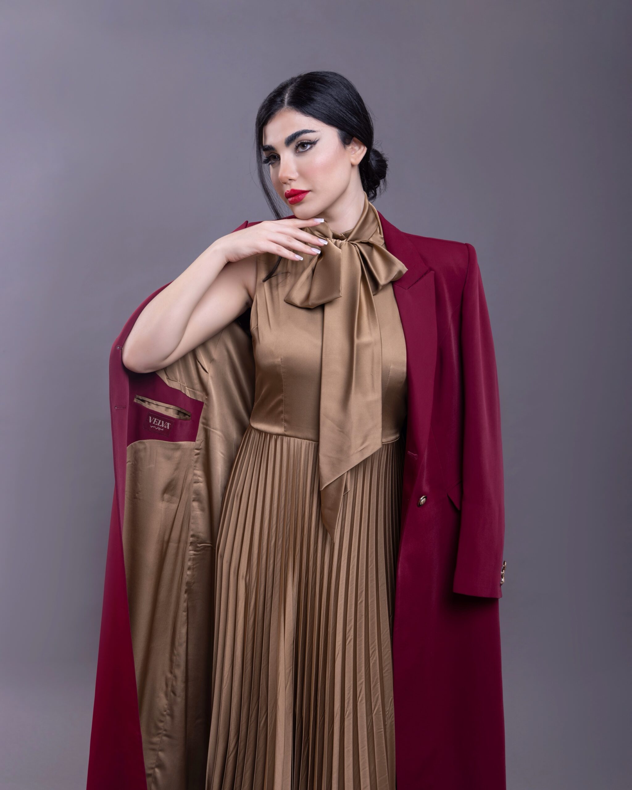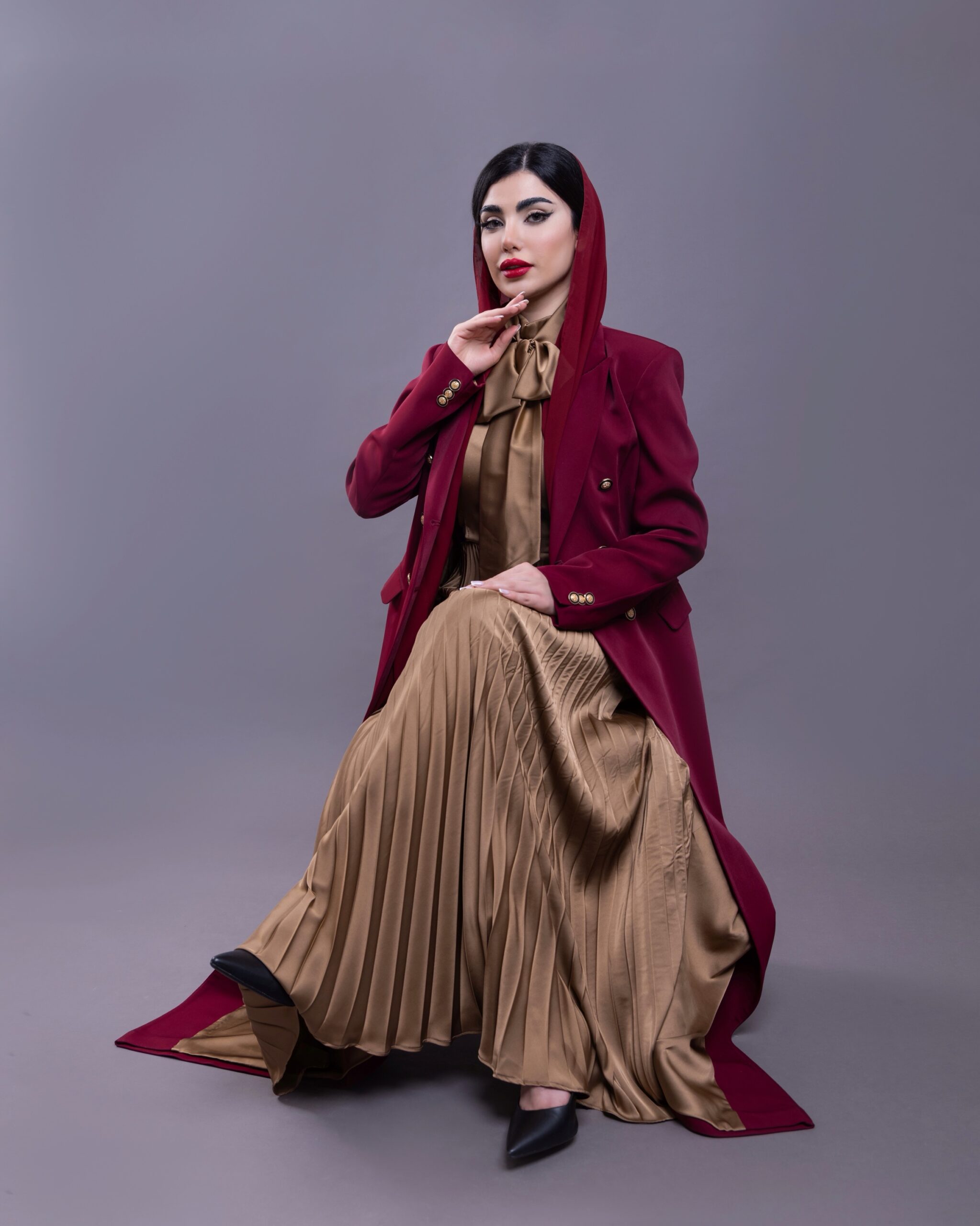 For a complete look we recommend pairing it with the Maroon dress featuring fluid pleats where it harmonizes with the color and fabric of the gold silk lining creating an elegant seamless appearance that reflects absolute sophistication when seated
