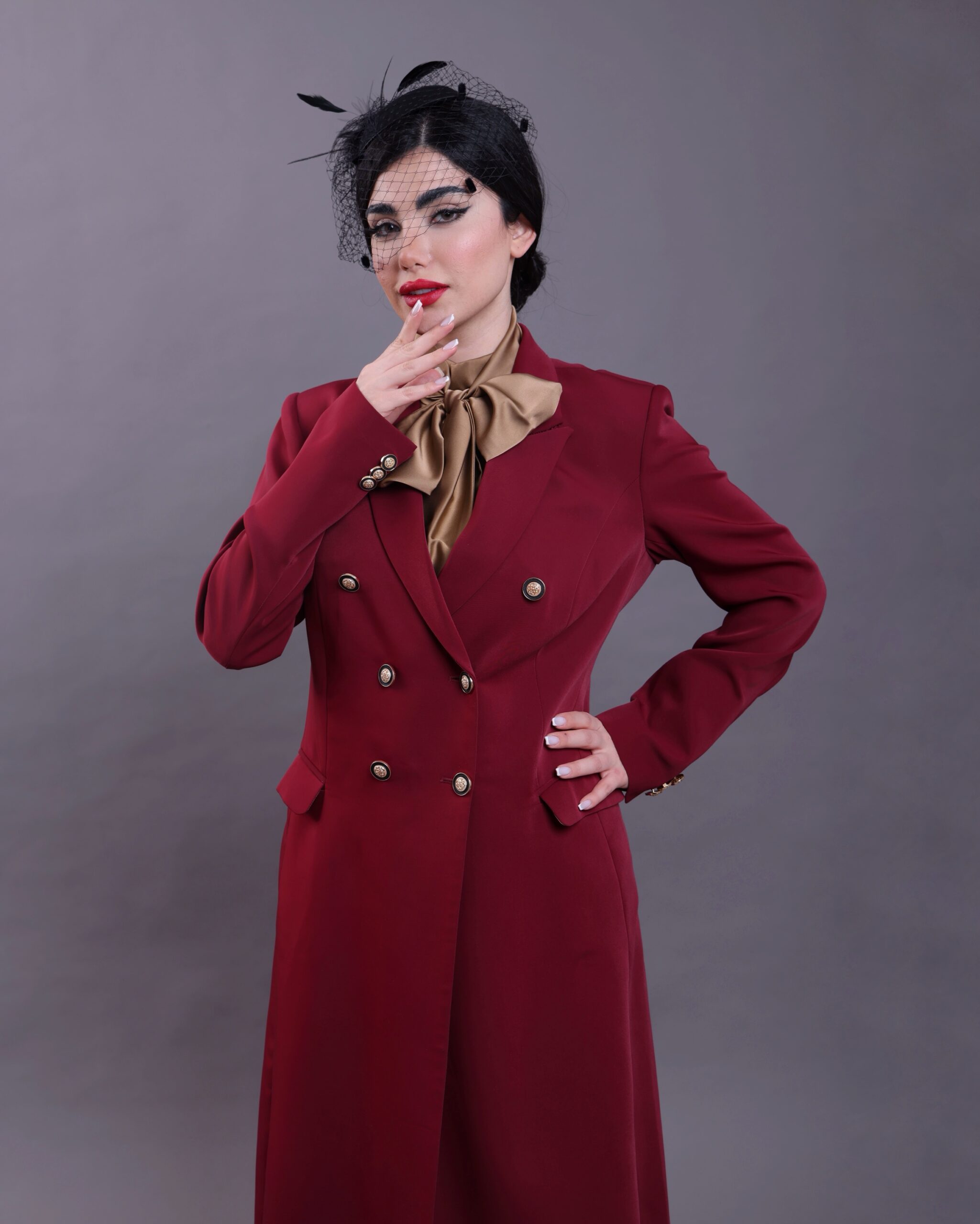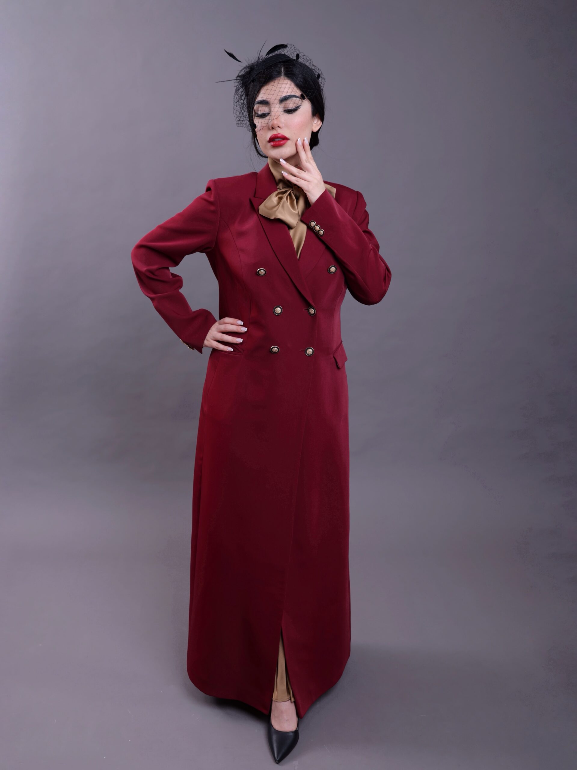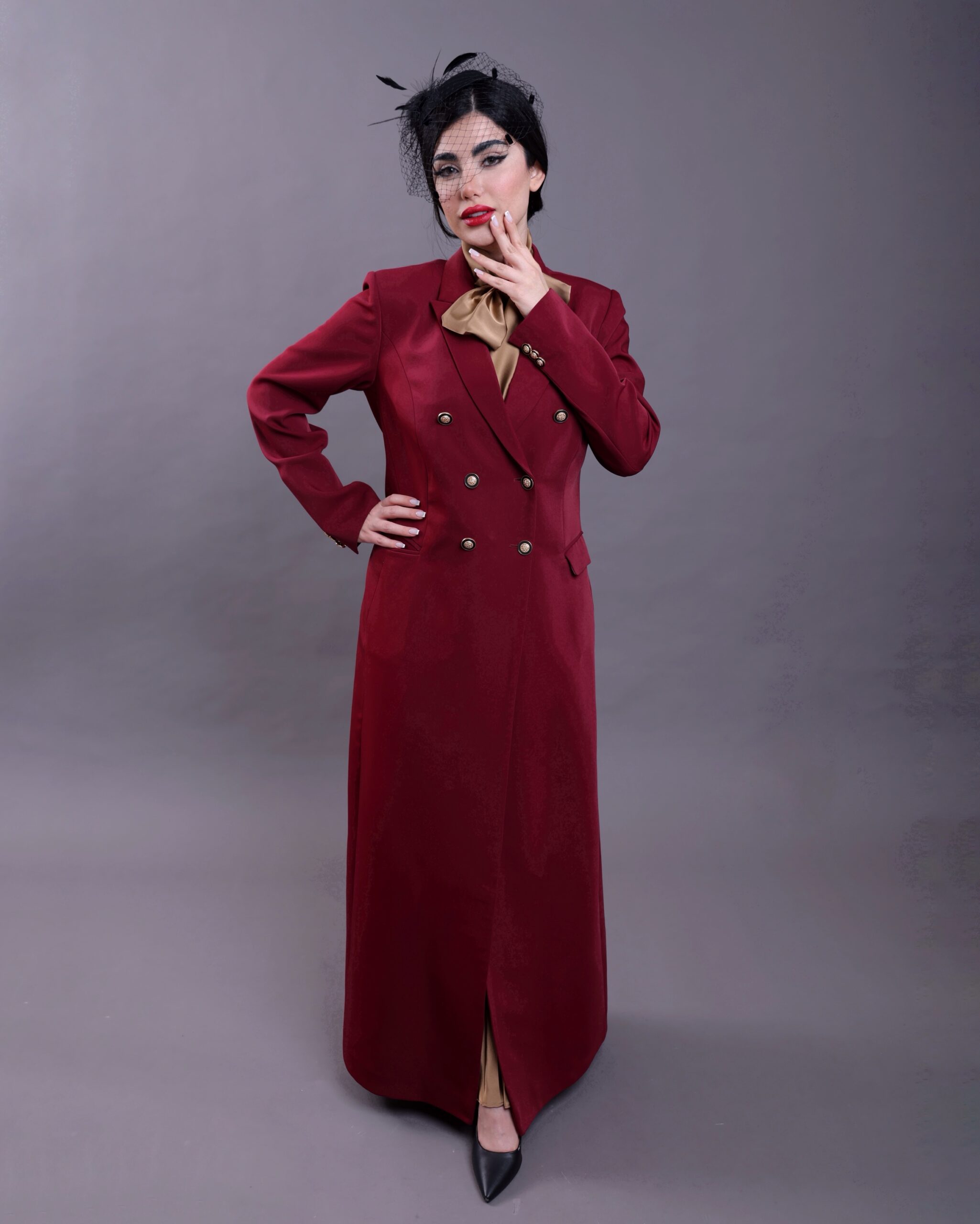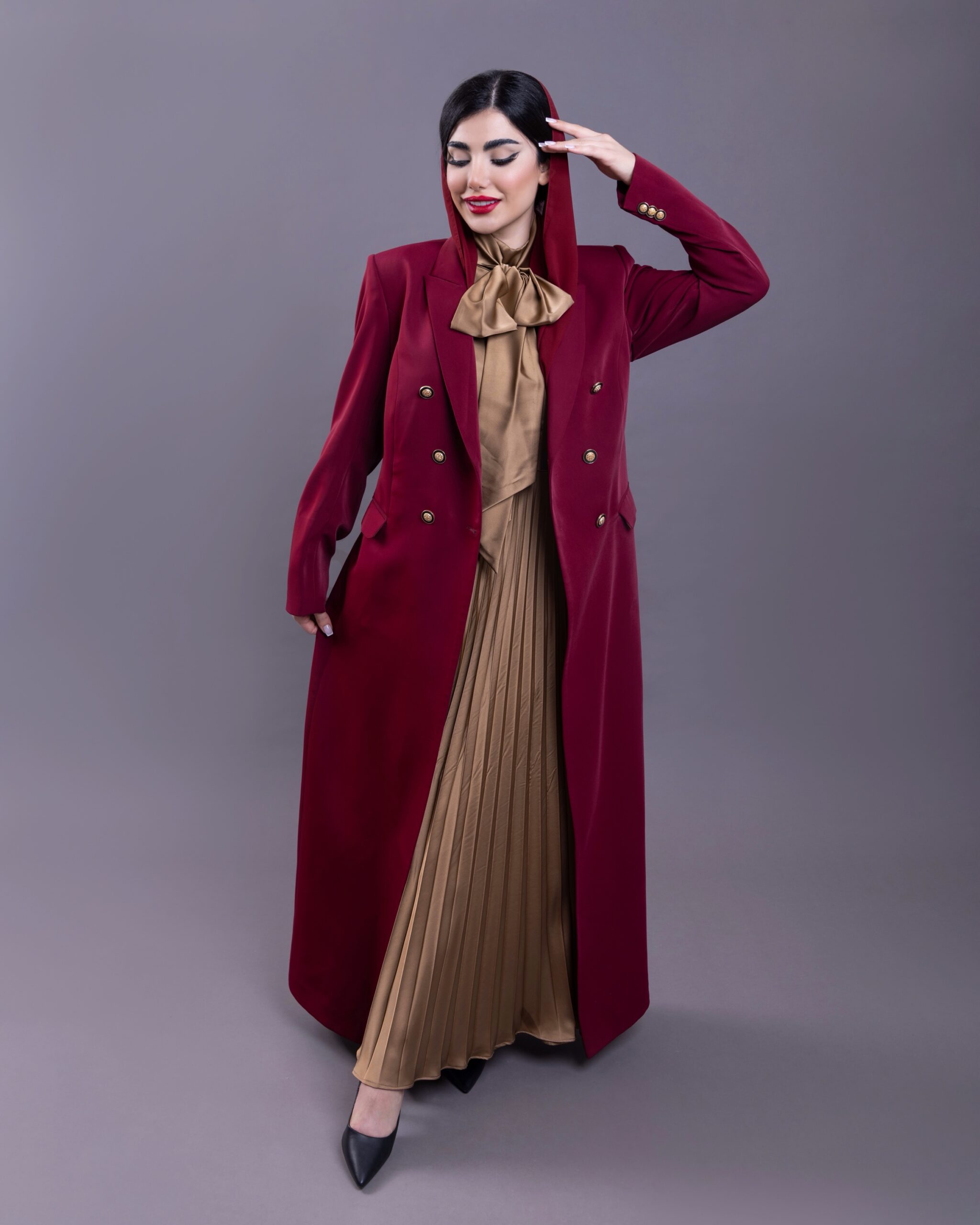 For a complete look we recommend pairing it with the Maroon dress featuring fluid pleats where it harmonizes with the color and fabric of the gold silk lining creating an elegant seamless appearance that reflects absolute sophistication when seated